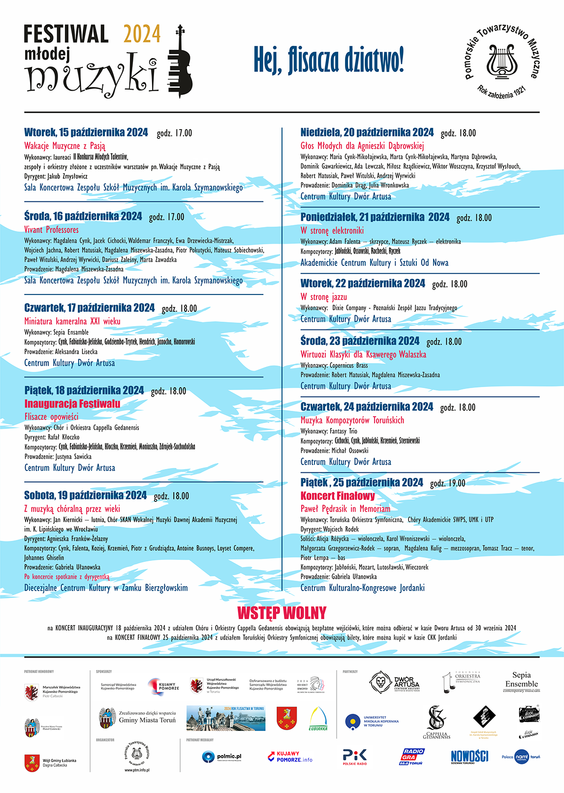 Festiwal będzie trwał od 15 do 25 października 2024 r. Uroczysta inauguracja odbędzie się z udziałem Orkiestry i Chóru Cappella Gedanensis pod batutą Rafała Kłoczko. Z kolei finałowy koncert uświetni Toruńska Orkiestra Symfoniczna pod batutą Wojciecha Rodka.
