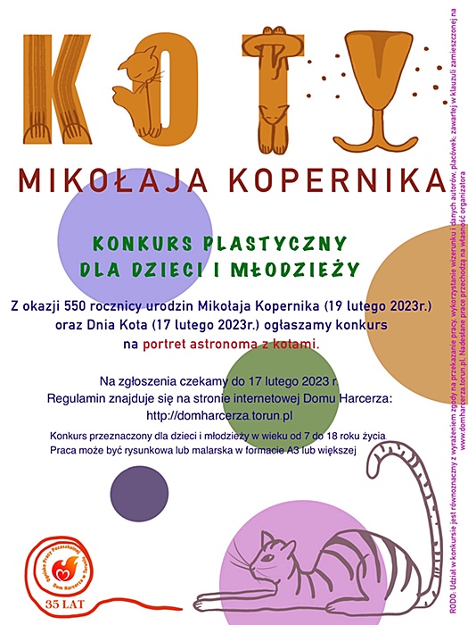 Ognisko Pracy Pozaszkolnej - Dom Harcerza w Toruniu ogłosiło Miejski Konkurs Plastyczny pn. „Koty Mikołaja Kopernika".
