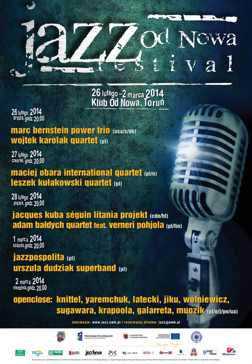 Piątek będzie miał szczególnie międzynarodowy charakter. Na początek usłyszymy formację kanadyjskiego trębacza polskiego pochodzenia Jacques Kuba Séguin Litania Projekt. Warto wspomnieć, że grający na kontrabasie Frédéric Alarie ma na swoim koncie m.in. współpracę z wybitnym kompozytorem muzyki filmowej Michelem Legrandem, a perkusista Kevin Warren pochodzi aż z Haiti. Lider formacji zafascynowany jest polską muzyką, szczególnie kompozycjami Krzysztofa Komedy. Nie dziwi więc, że jego koncerty charakteryzują się melodyjnością i, jak piszą organizatorzy, „naznaczone są skupieniem i kontemplacją”. Płytę „Litania Projekt” wydał on W 2012 r. we współpracy z Adamem Bałdychem. Ten znakomity skrzypek i kompozytor także wystąpi tego dnia w Od Nowie ze swoim kwartetem, do którego dołączy jeden z czołowych fińskich jazzmanów Verneri Pohjola. W ich wykonaniu z pewnością można się spodziewać świeżego i oryginalnego spojrzenia na muzykę jazzową.