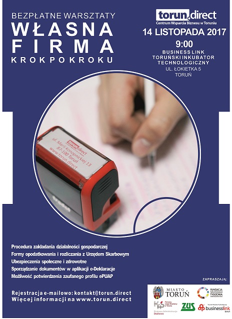 W ramach Światowego Tygodnia Przedsiębiorczości w dniu 14 listopada 2017 roku odbędą się warsztaty „Własna firma. Krok po kroku”. Ruszyły już zapisy na to wydarzenie – zgłoszenie należy przesłać na adres: kontakt@torun.direct