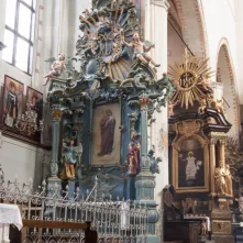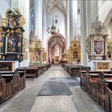 Przestronne wnętrze kościoła wypełnione jest cennymi dziełami sztuki. W prezbiterium, które wzniesione zostało już w I poł. XIV wieku, zachowały się pochodzące z tego samego stulecia gotyckie malowidła ukazujące patronów świątyni - św. Jana Chrzciciela i Ewangelistę, a także monumentalny, wielowątkowy średniowieczny obraz przedstawiający Sąd Ostateczny. W okresie średniowiecza powstał również ołtarz główny św. Wolfganga, a także fragmenty barwnych witraży i strzeliste sklepienia. W trzech nawach kościoła znajduje się kilkanaście renesansowych i barokowych ołtarzy oraz wiele epitafiów toruńskich mieszczan i okolicznej szlachty. Największym zainteresowaniem cieszy się jednak kaplica z chrzcielnicą, przy której w 1473 roku ochrzczono Mikołaja Kopernika. Około stu lat później zawieszono tu zachowane do dziś renesansowe epitafium z portretem astronoma. W czasach napoleońskich w kaplicy umieszczono też najstarsze, ale niezbyt udane, popiersie Kopernika, wyrzeźbione w 1766 roku. Za nim na ścianie znajduje się rysunek wskazujący, że w tym właśnie miejscu pochowano serce króla Jana Olbrachta, zmarłego w Toruniu w 1501 roku.